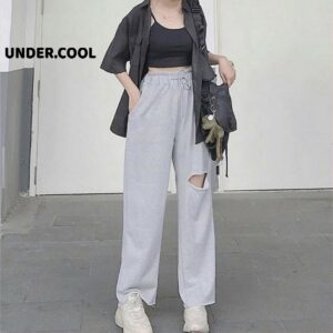 Quần nỉ ống rộng suông nữ UNDERCOOL cạp chun chất da cá quần vải ống rộng nỉ thun xuông dài đẹp retro pants QD23