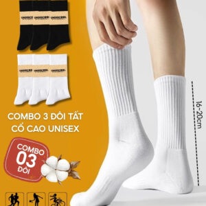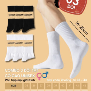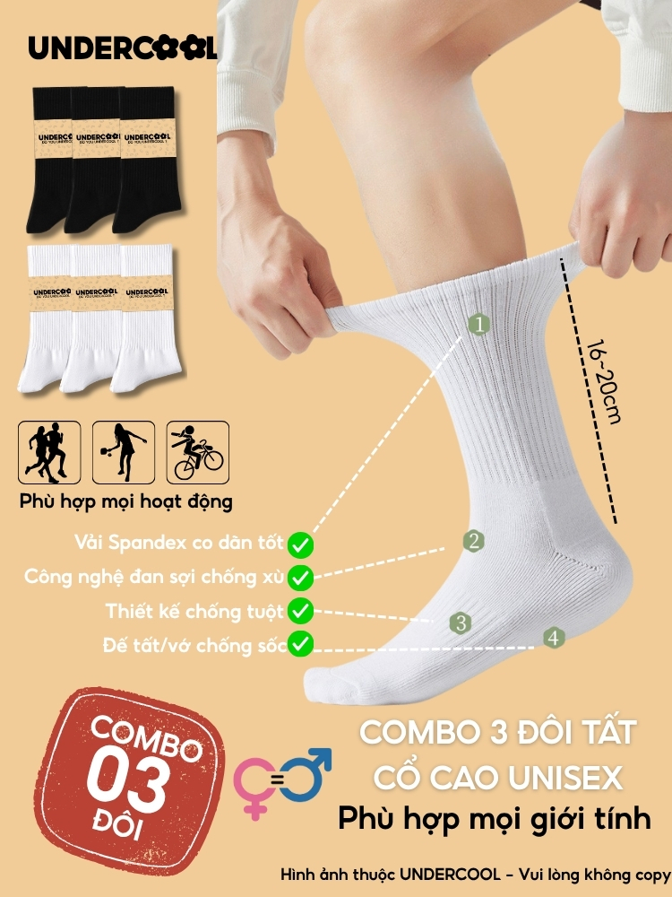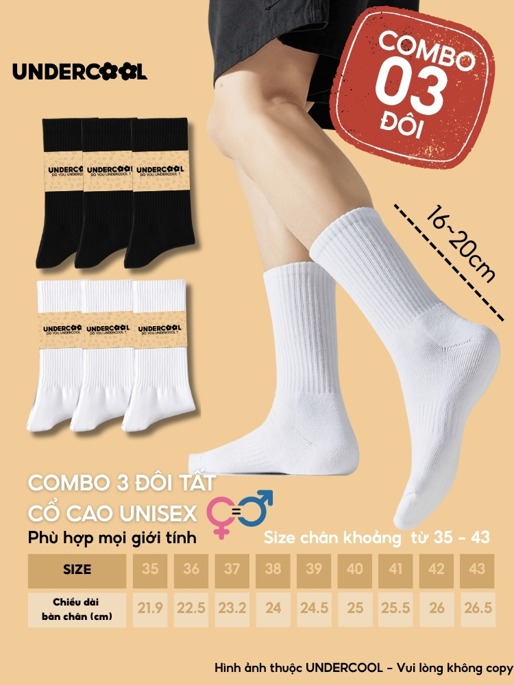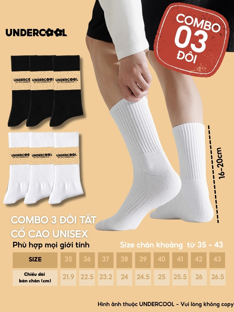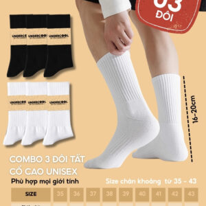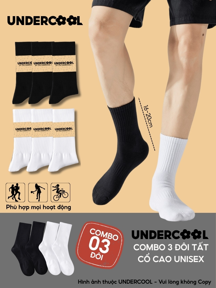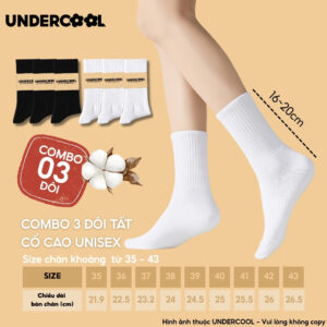 Combo 3 Đôi Tất Vớ Nam Nữ Cổ Cao UNDERCOOL TC91 – Thiết kế basic năng động, chất liệu cotton cao cấp, co giãn êm ái, thấm hút mồ hôi tốt, giúp chống hôi chân hiệu quả khi mang giày cả ngày. Phần cổ cao 16–20cm vừa giữ ấm cổ chân, vừa hạn chế trầy xước khi vận động, phù hợp cho thể thao hoặc mặc hằng ngày.