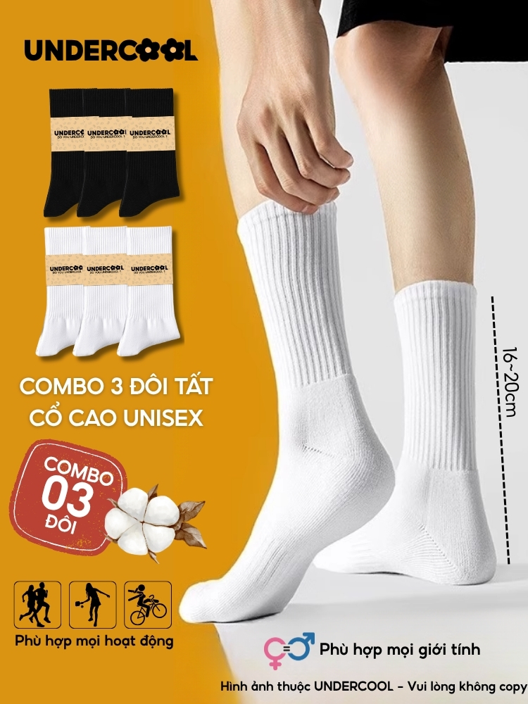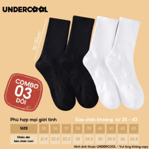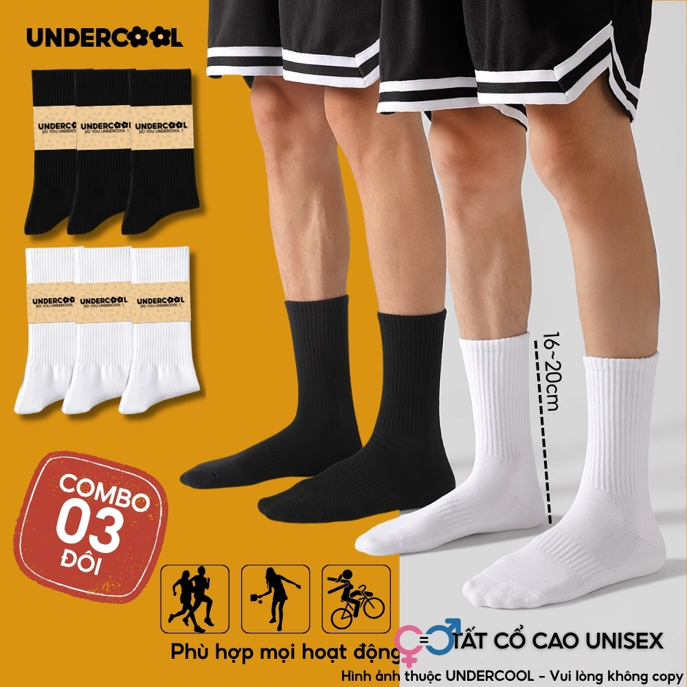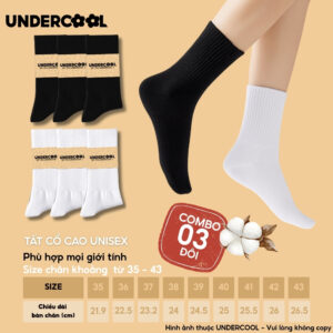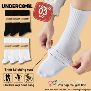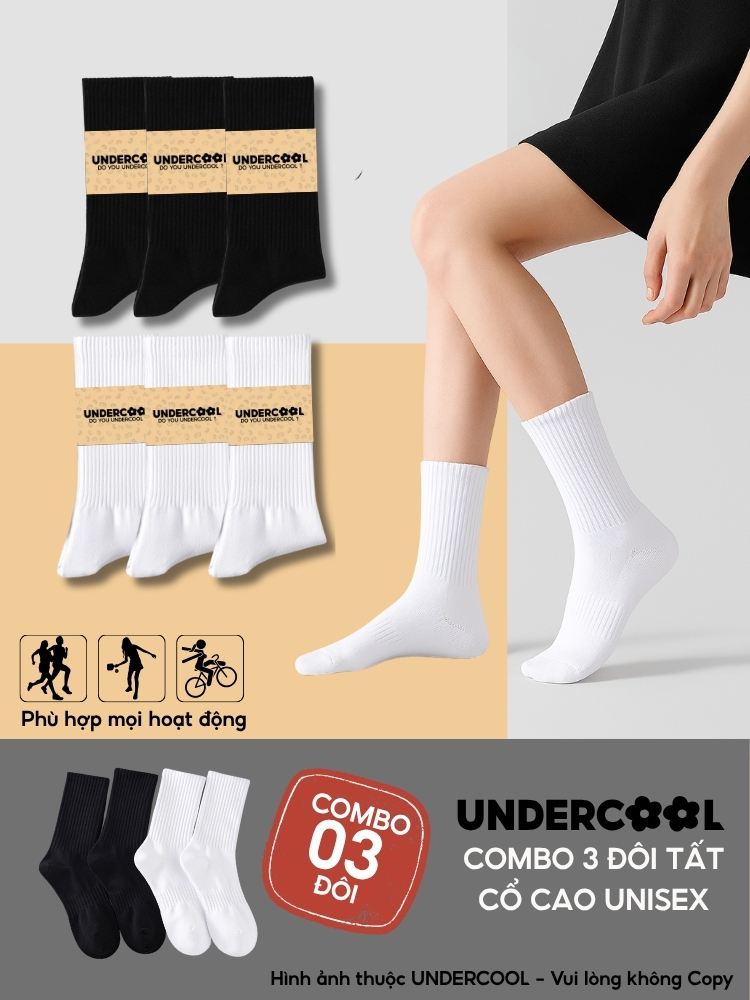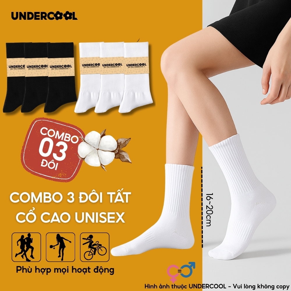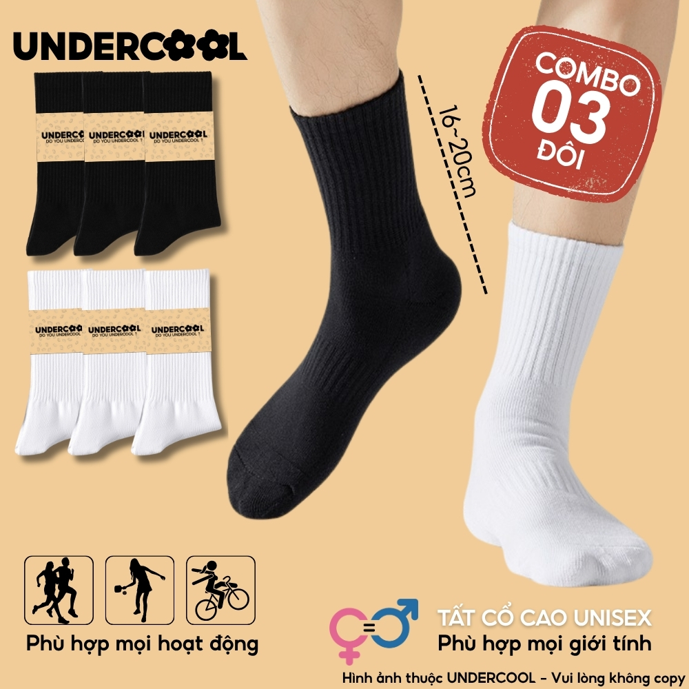 Combo 3 Đôi Vớ Tất Cổ Cao Nữ – Nam – Unisex UNDERCOOL Cotton Dày Dặn, Thoáng Khí, Co Giãn Tốt, Vớ Thể Thao Basic CB-TC91