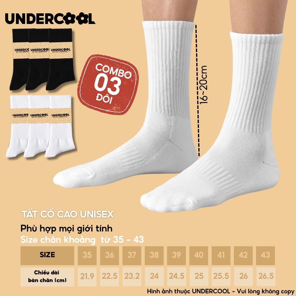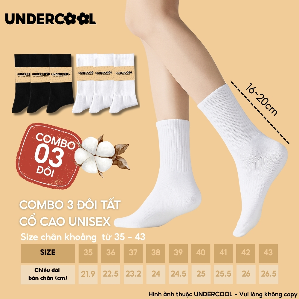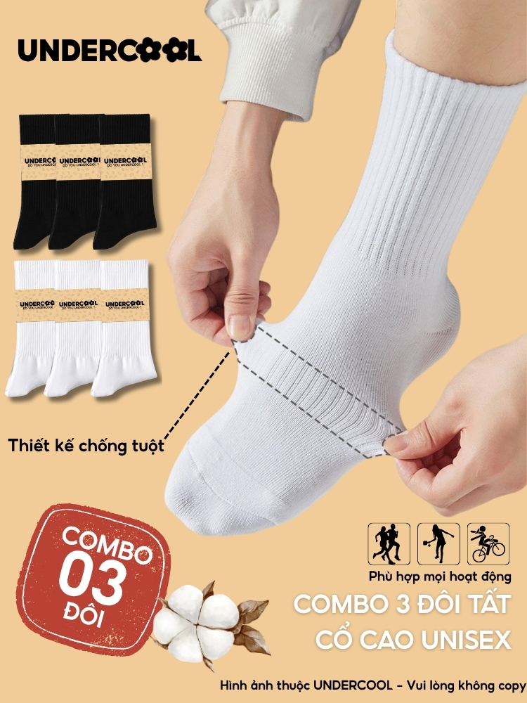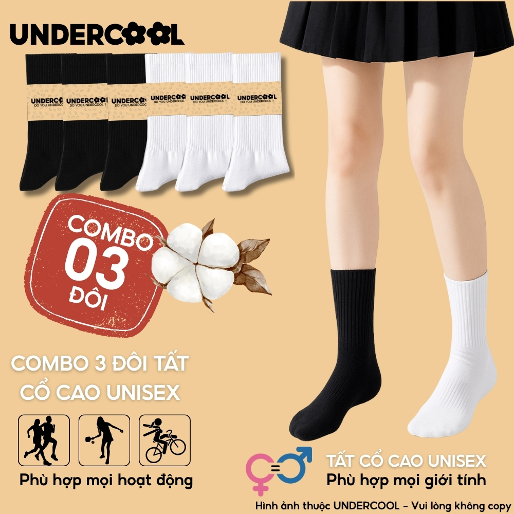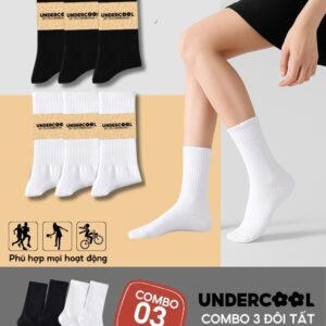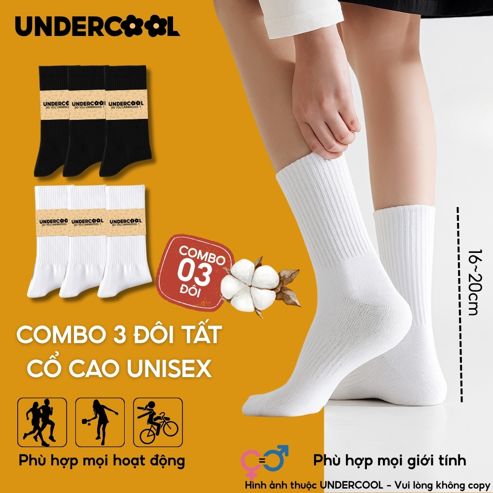 Combo 3 Đôi Vớ Tất Cổ Cao Nữ – Nam – Unisex UNDERCOOL Cotton Dày Dặn, Thoáng Khí, Co Giãn Tốt, Vớ Thể Thao Basic CB-TC91