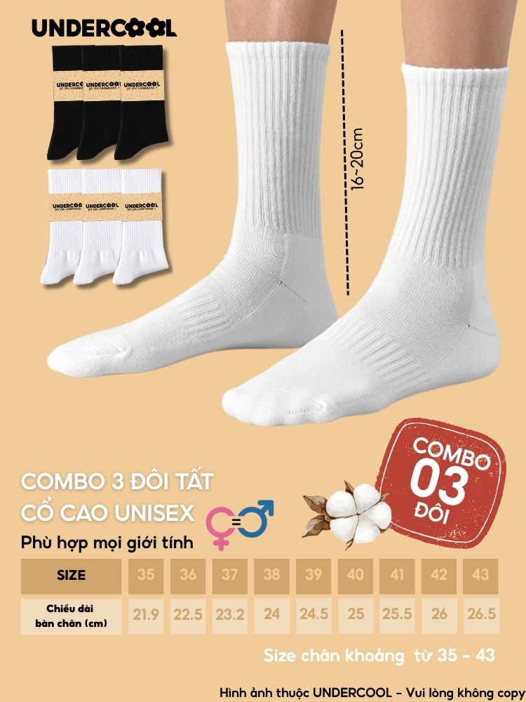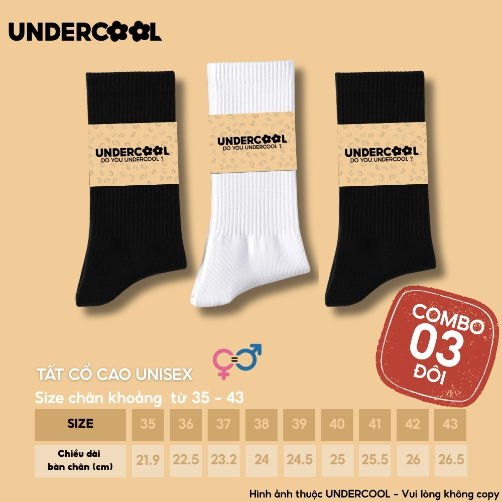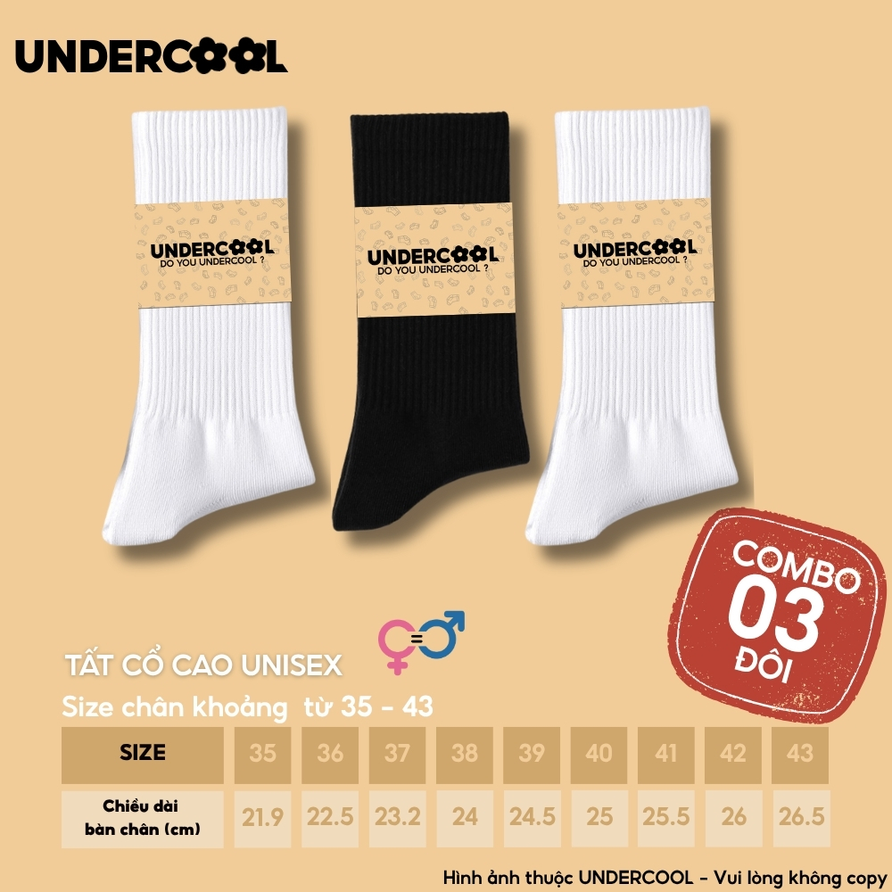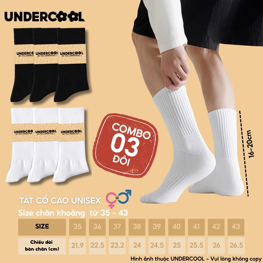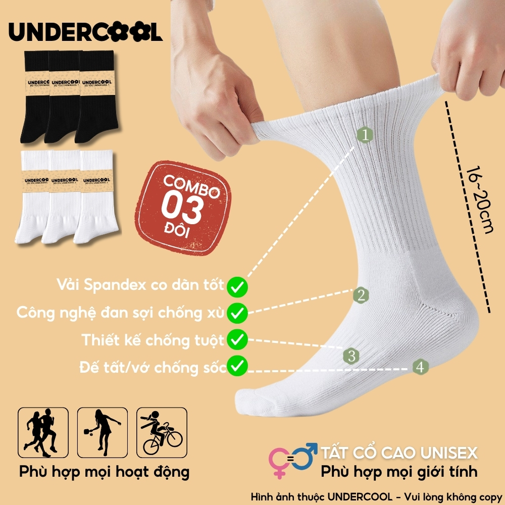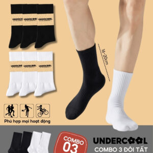 Combo 3 Đôi Vớ Tất Cổ Cao Nữ – Nam – Unisex UNDERCOOL Cotton Dày Dặn, Thoáng Khí, Co Giãn Tốt, Vớ Thể Thao Basic CB-TC91