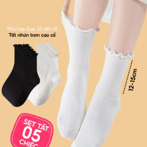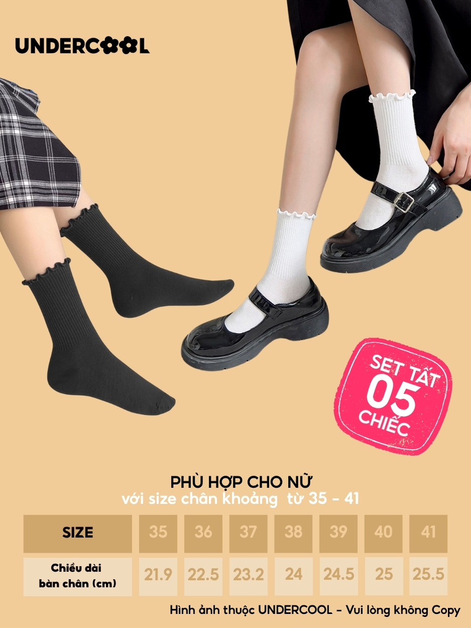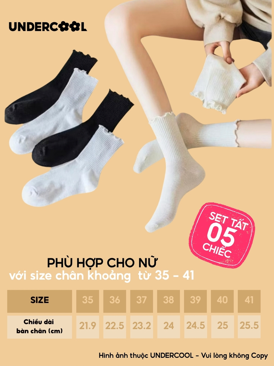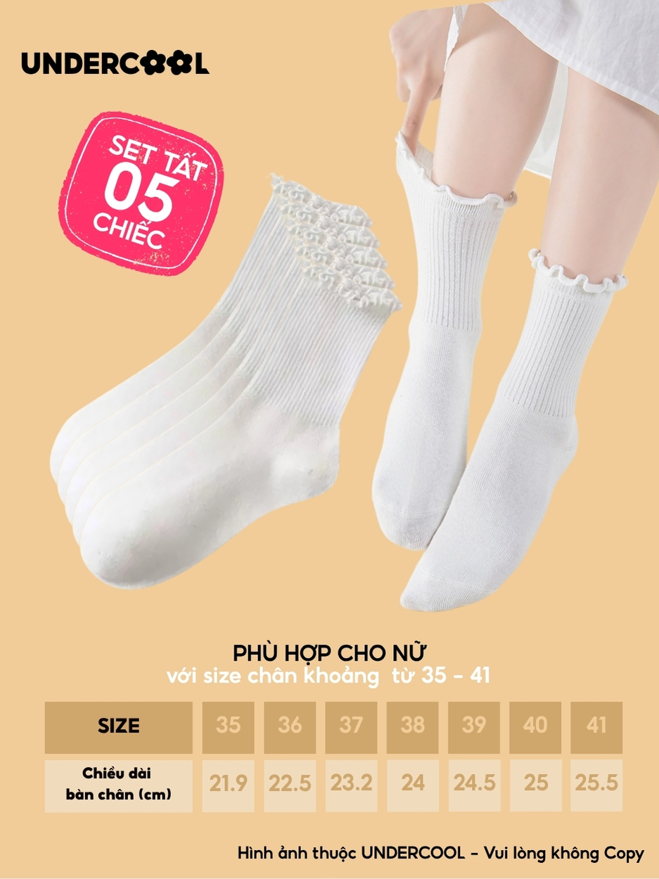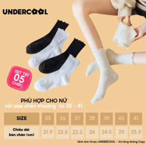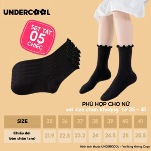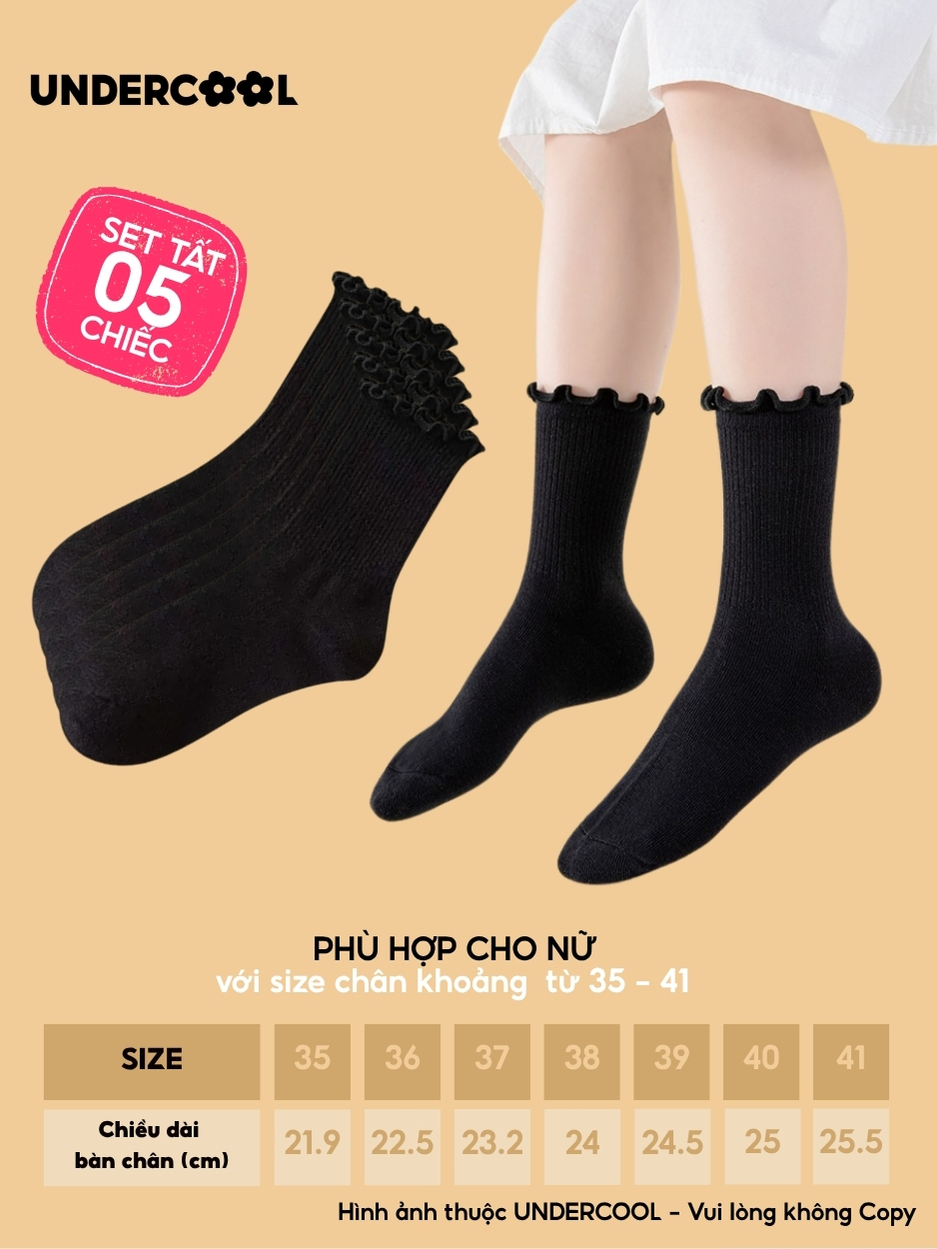 Combo 5 Đôi Tất Vớ Cổ Cao Nữ Bèo Nhún UNDERCOOL Cotton Trơn – Vớ chân Chất Cotton Êm Ái, Dày Dặn Mềm, Thoáng Khí CB-TC68
