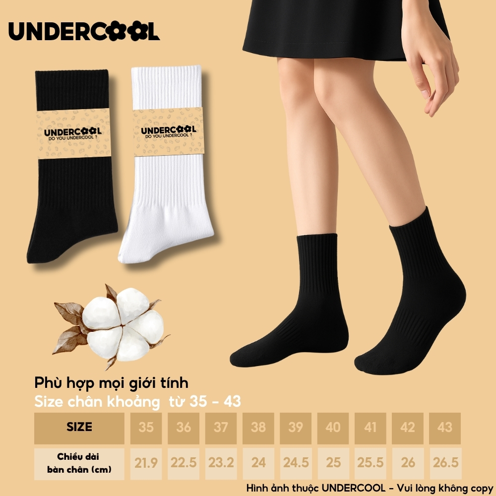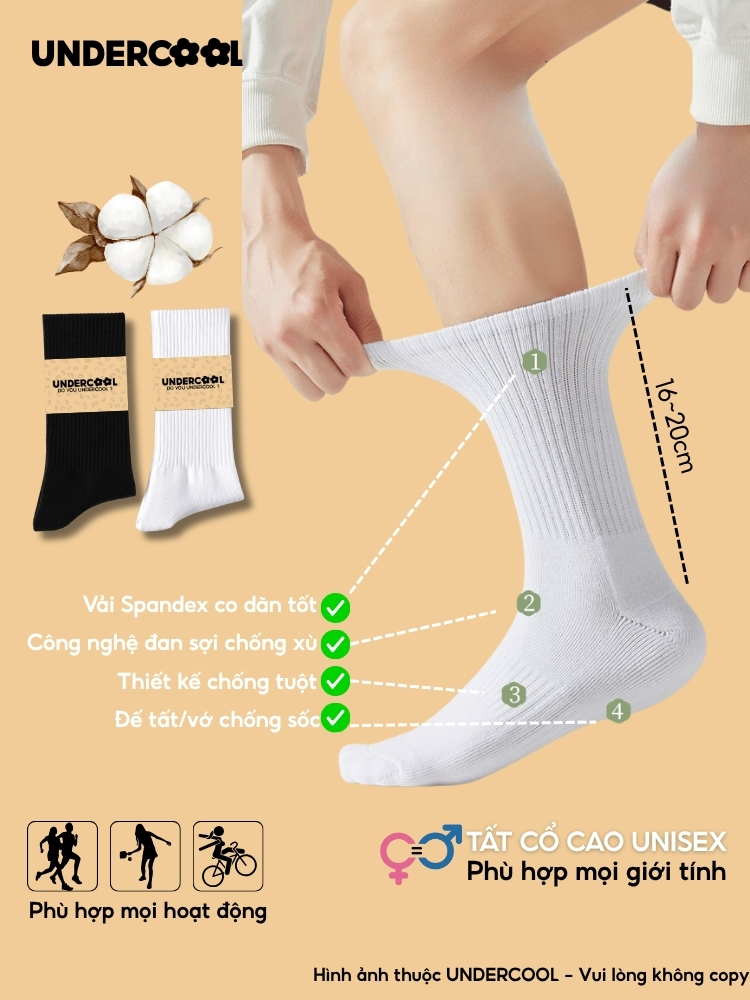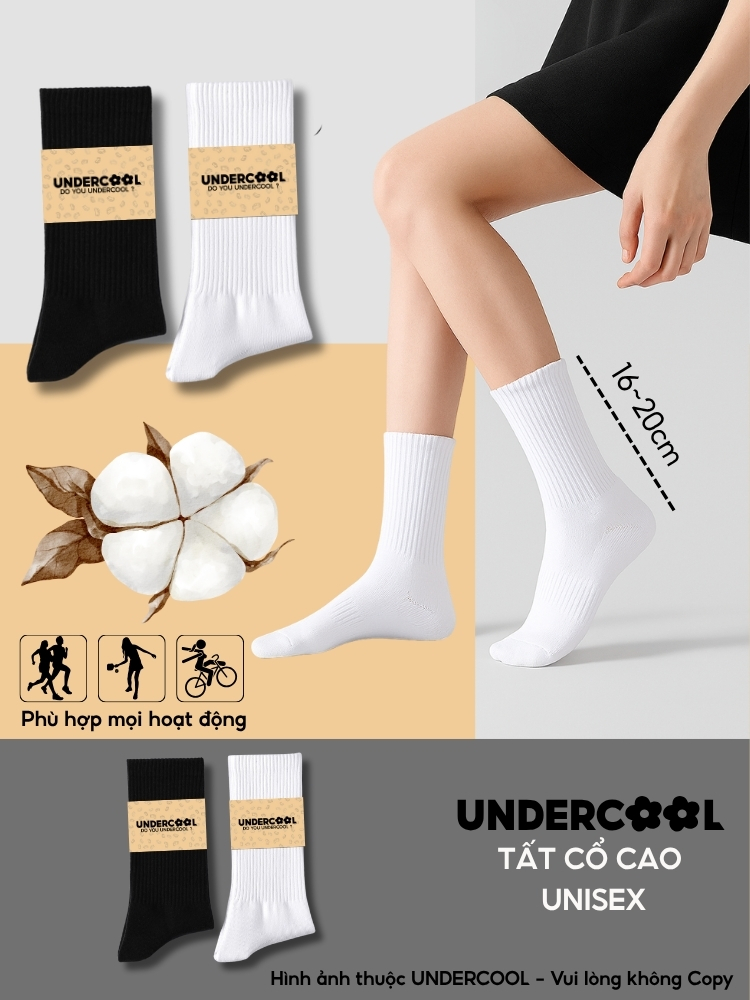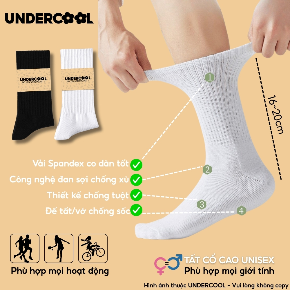 Tất Vớ Nữ Nam Cổ Cao Cotton UNDERCOOL Thoáng Mát Chống Hôi Chân, Co Giãn Tốt, Vớ Thể Thao Dày Dặn Basic TC91