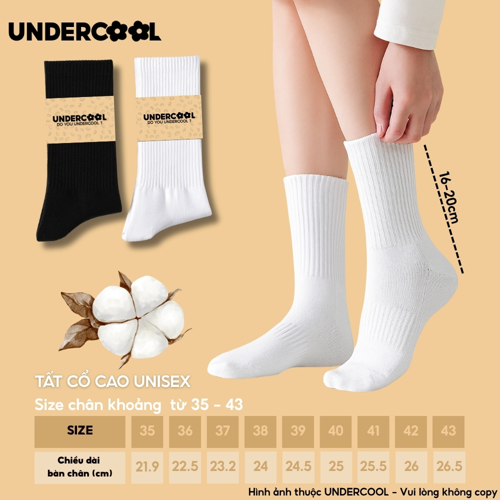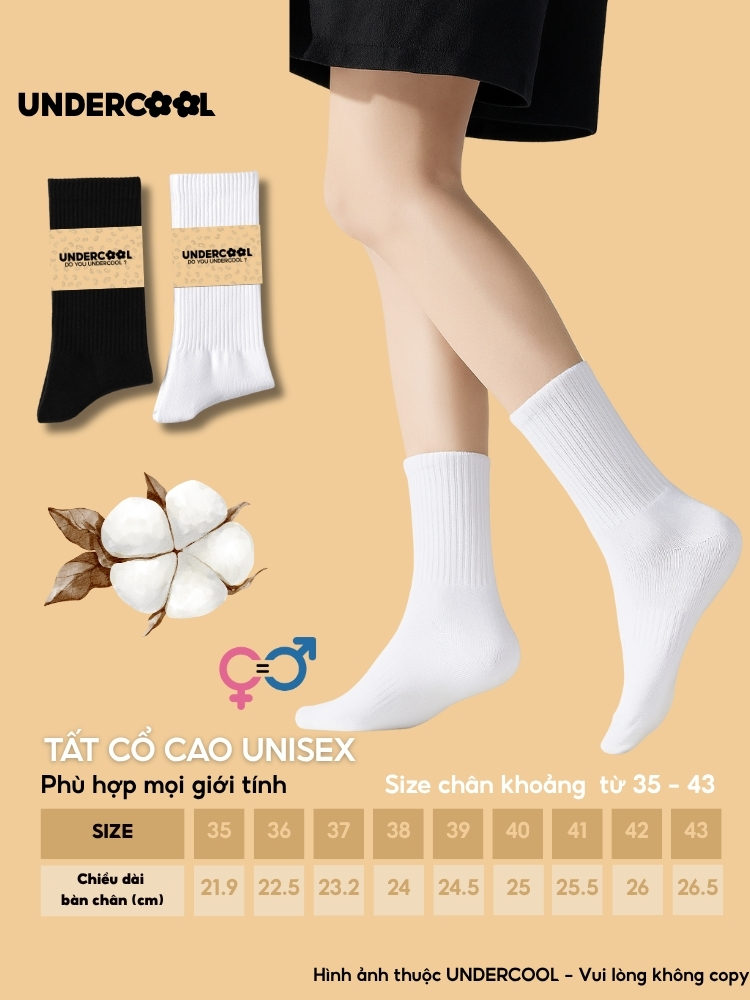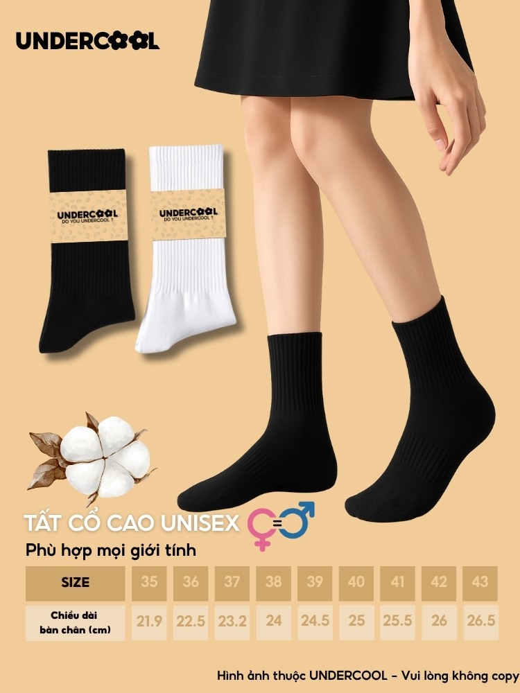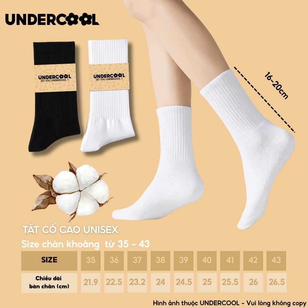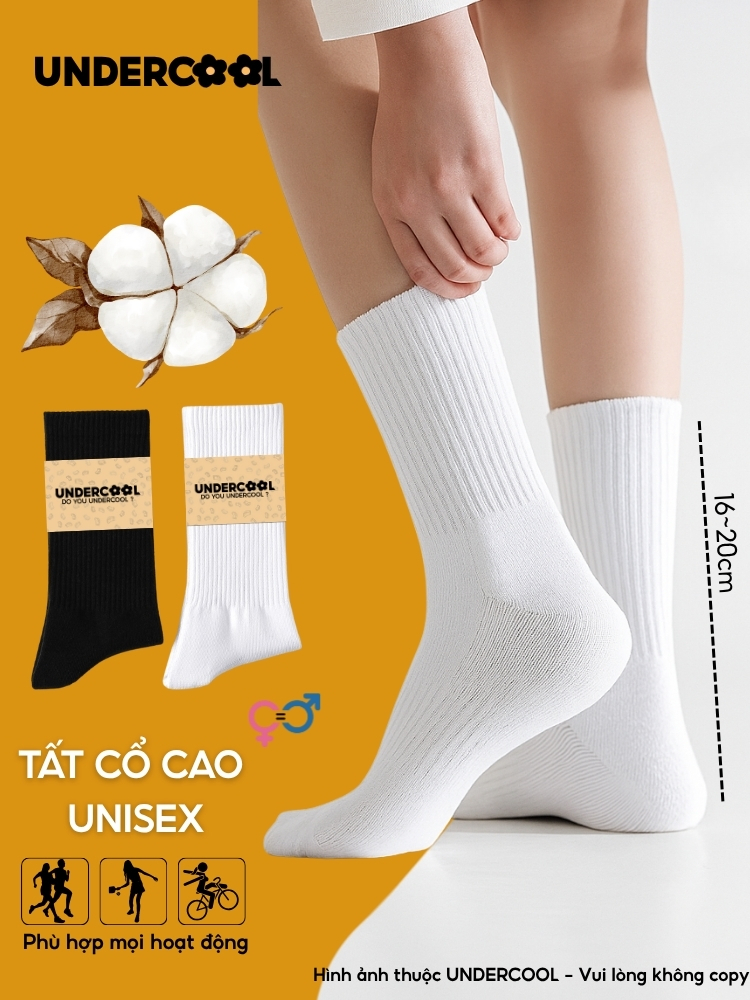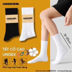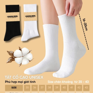 Tất Vớ Nam Nữ Cổ Cao Cotton UNDERCOOL TC91 là lựa chọn lý tưởng cho những ai yêu thích phong cách basic nhưng đề cao sự thoải mái. Chất liệu cotton dày dặn, co giãn tốt giúp ôm chân vừa vặn, thấm hút mồ hôi hiệu quả và chống hôi chân khi mang giày cả ngày. Thiết kế cổ cao 16–20cm giúp giữ ấm cổ chân, đồng thời tạo điểm nhấn thời trang cho outfit thể thao, dạo phố hay đi làm.