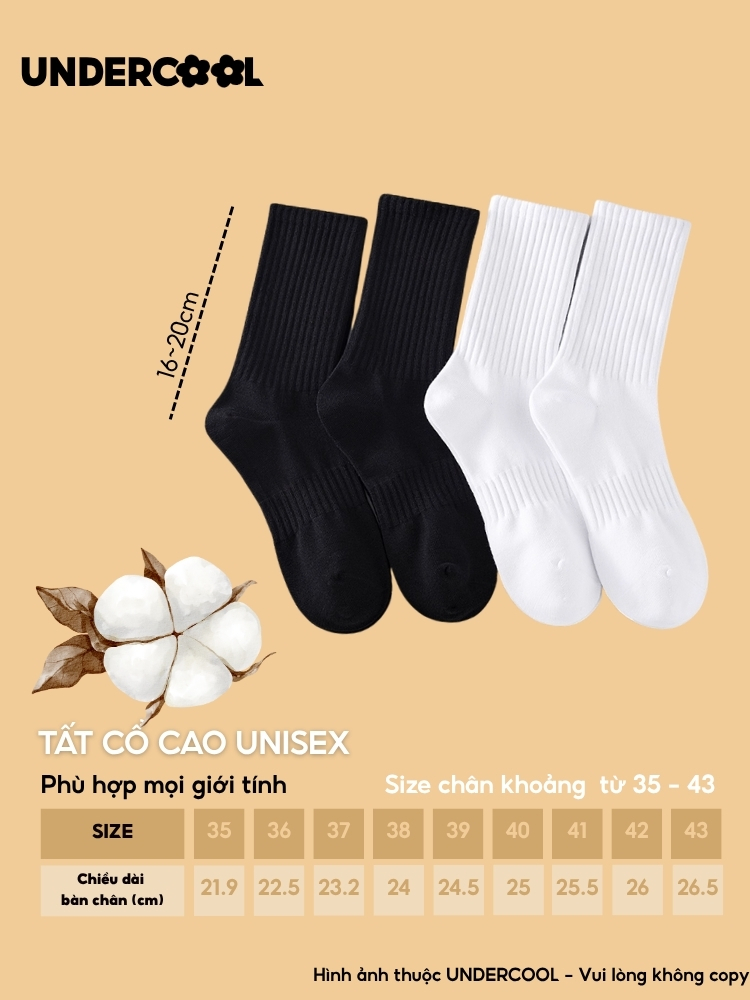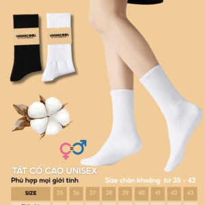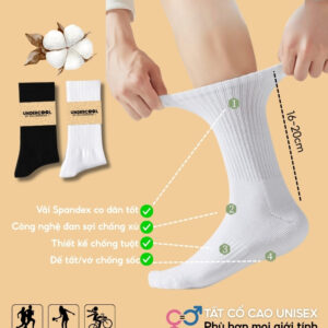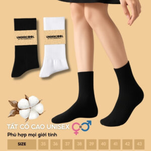 Tất Vớ Nam Nữ Cổ Cao Cotton UNDERCOOL TC91 – thiết kế tối giản, thoáng mát, dày dặn, lý tưởng cho cả đi học, đi làm và vận động thể thao. Chất vải cotton co giãn tốt, thấm hút mồ hôi, chống hôi chân hiệu quả khi mang giày cả ngày. Phần cổ tất cao 16–20cm bảo vệ cổ chân, hạn chế trầy xước khi vận động mạnh.