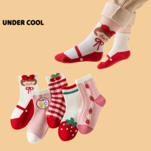Set 5 Đôi Tất Vớ Cotton trẻ em 1-12 tuổi UNDERCOOL Chống trượt họa tiết Dâu Hồng, xinh xắn dễ thương TC59